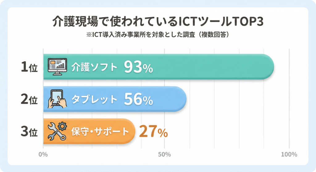 また、ICTを導入した事業所の93%が介護ソフトを導入し、56%がタブレットを、27%が保守・サポートを介護現場で使用していることがわかりました。
