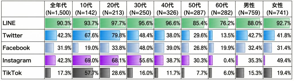 総務省が2021年度に発表した「令和2年度情報通信メディアの利用時間と情報行動に関する調査報告書」によると、LINEは国内で普及している全SNSのなかでは利用率1位を誇ります。つまり、日本の大部分の世帯でLINEが使用されている計算です。年齢別でも、10代から40代までのLINE利用率は90%を超えるほどの人気ぶりです。