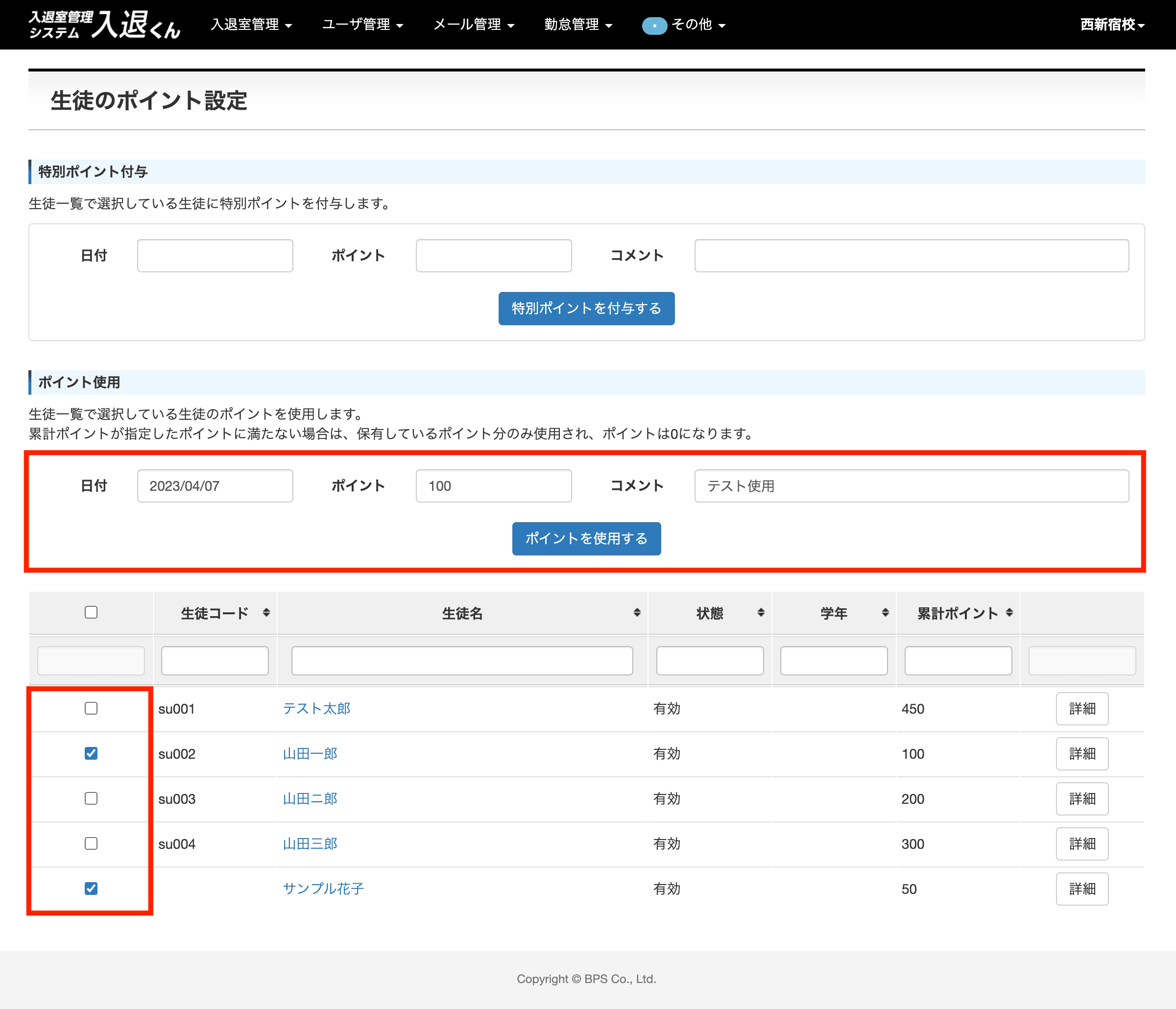 2. 複数の生徒に一括で特別ポイントを付与できます。