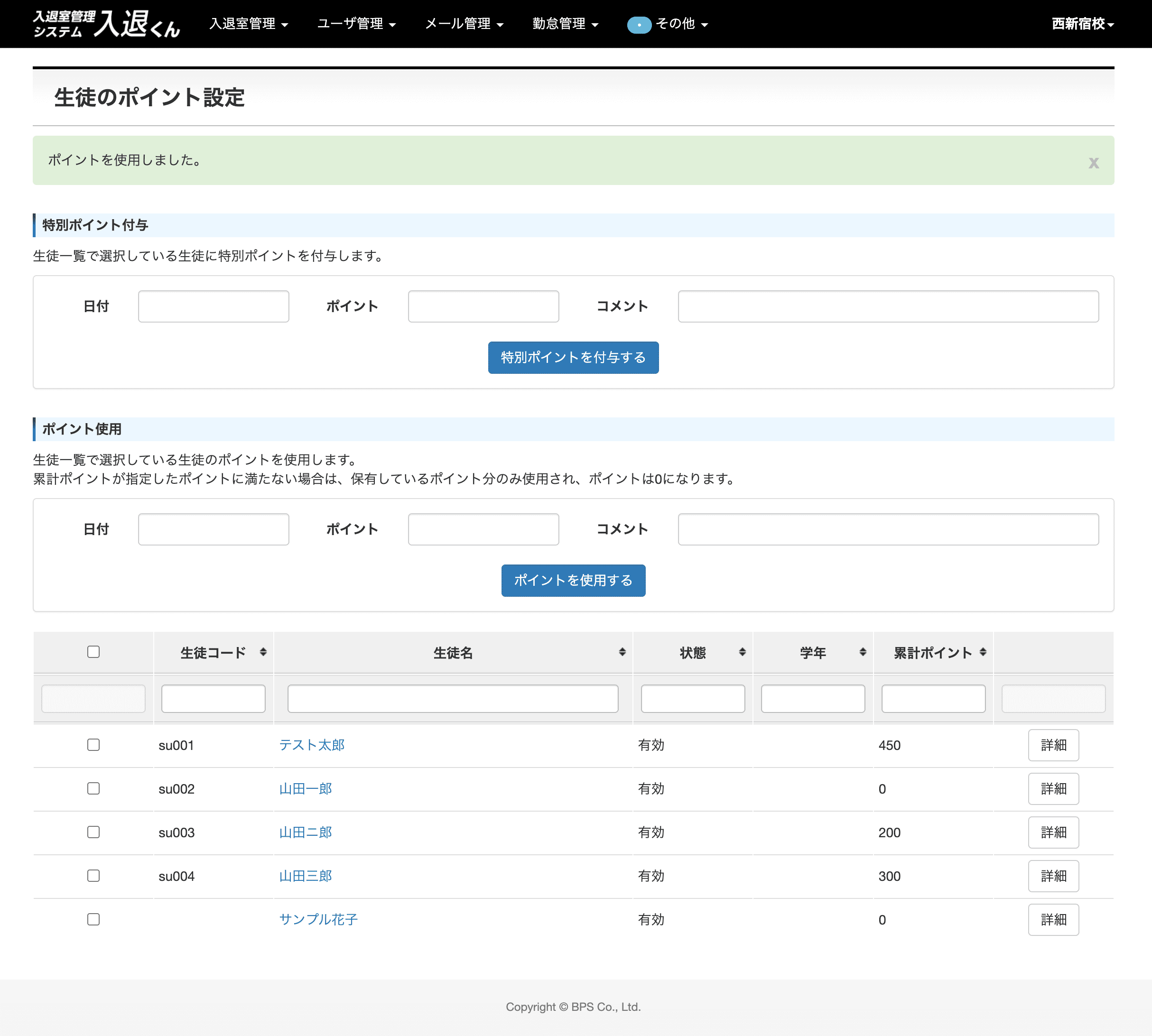 ポイントを使用したい生徒にチェックを入れ、日付・使用するポイント数・コメント(任意)を記載し[ポイントを使用する]をクリックしてください。